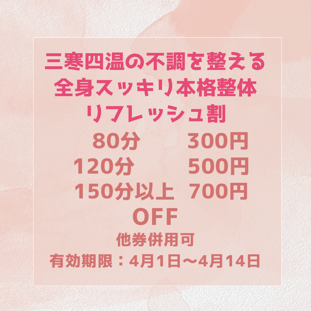 三寒四温の不調を整える。全身スッキリ本格整体・リフレッシュ割|4/1〜4/14【整体名古屋】
