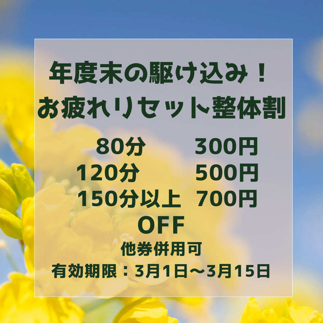 年度末の駆け込み!お疲れリセット整体割|3/1〜3/15【整体名古屋・本格整体】