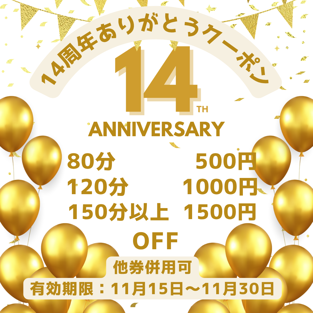 【からだ工房本館】14周年“ありがとう”を込めて。11月30日まで特別クーポン継続中!