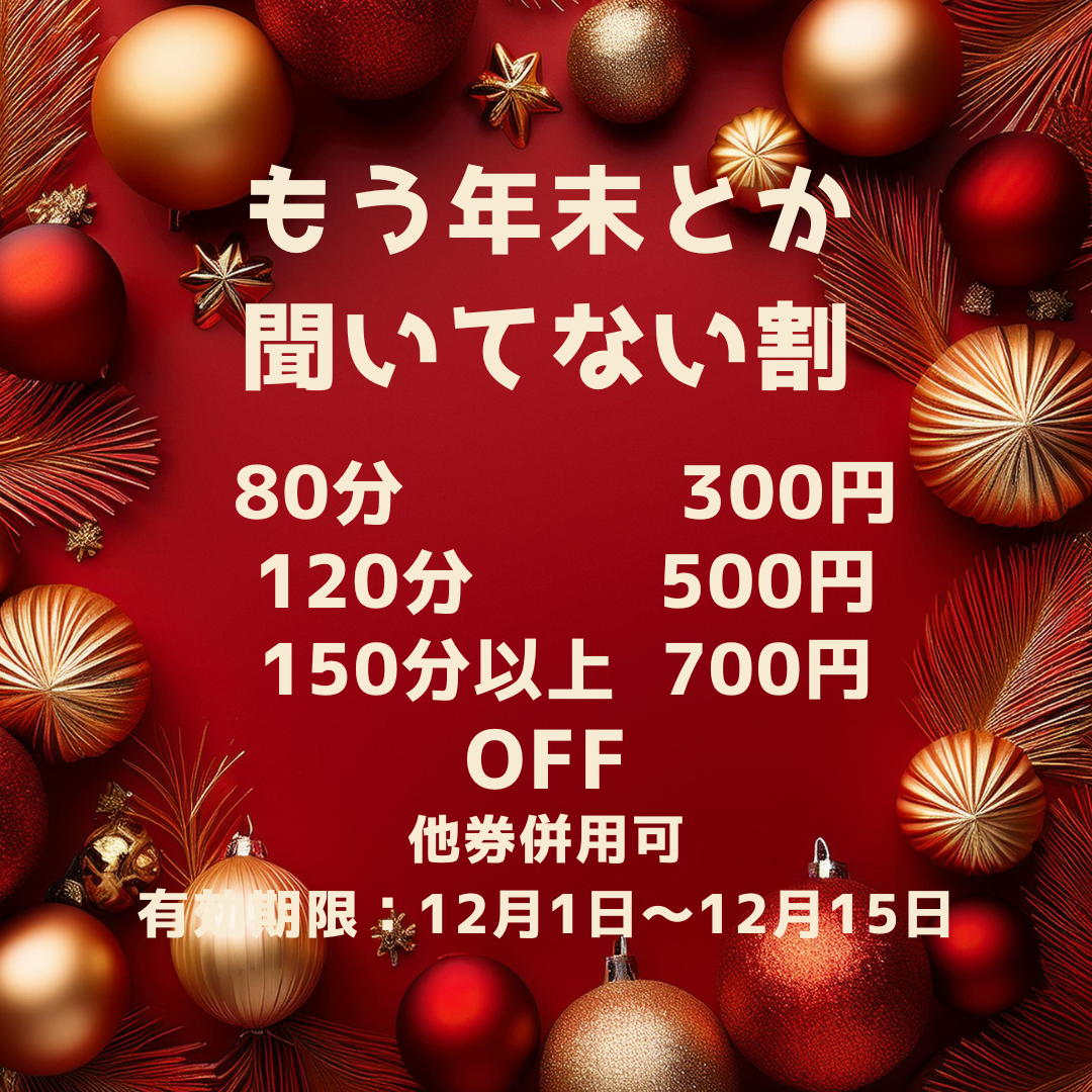 今回の「もう年末とか聞いてない割」は、体の状態に合わせてしっかり整えてほしいという想いから、時間に応じて割引額を変えました。